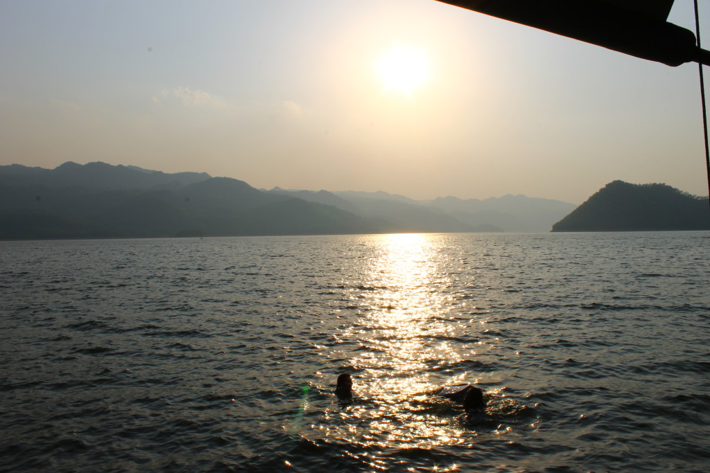 Once we were safely parked near a large rock outcropping, we all hopped in the water for a swim and we bobbed around for an hour or so chatting with each other about our lives back in our respective countries. We watched the sunset and enjoyed being the only people on the entire lake. It felt like we were on another planet, to be honest. It was wonderful, apart from the fact I couldn’t stop thinking about how my doctor told me not to swim in any freshwater rivers or lakes…..whoops. Oh well. Maybe if I get a parasite it will help get rid of the massive amount of Thai food I’ve been eating since I’ve been here.