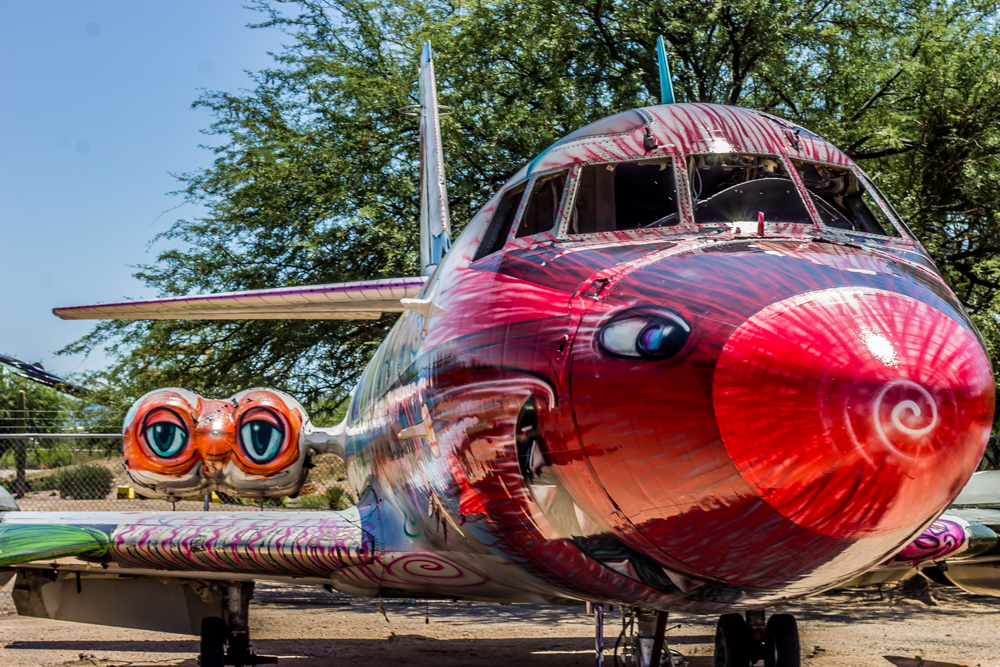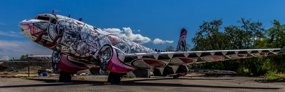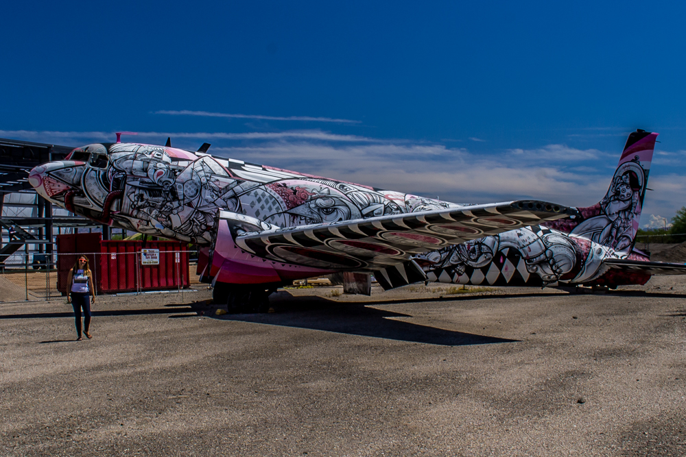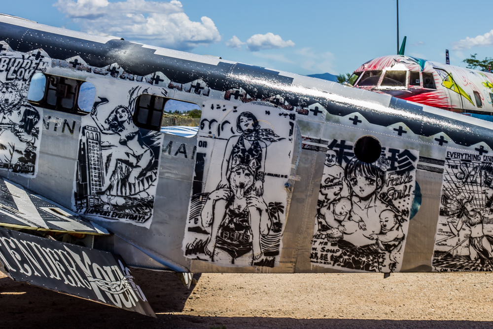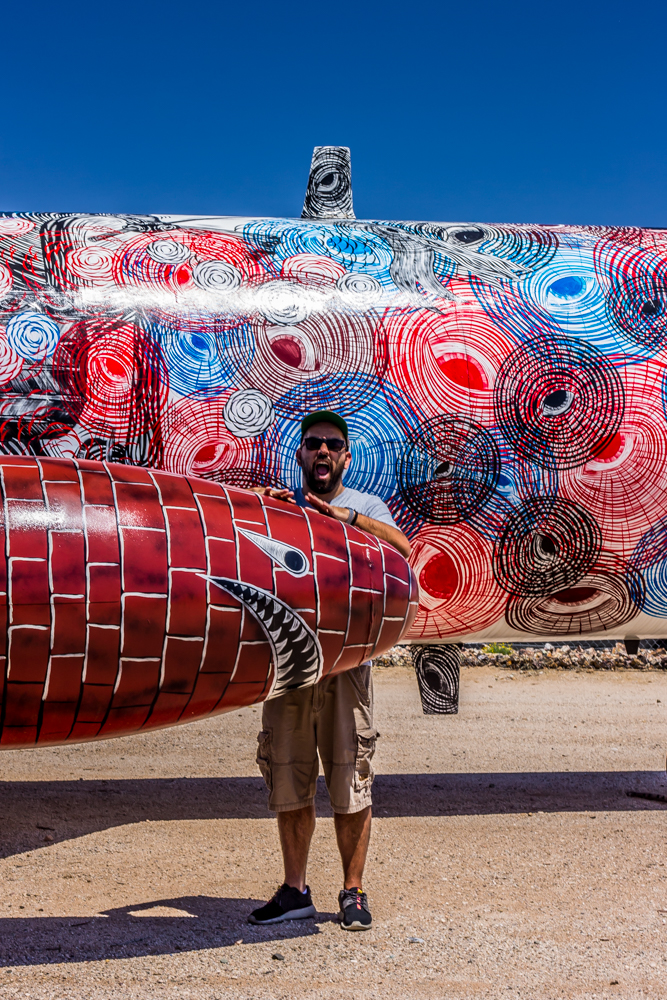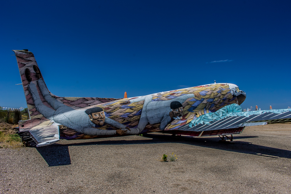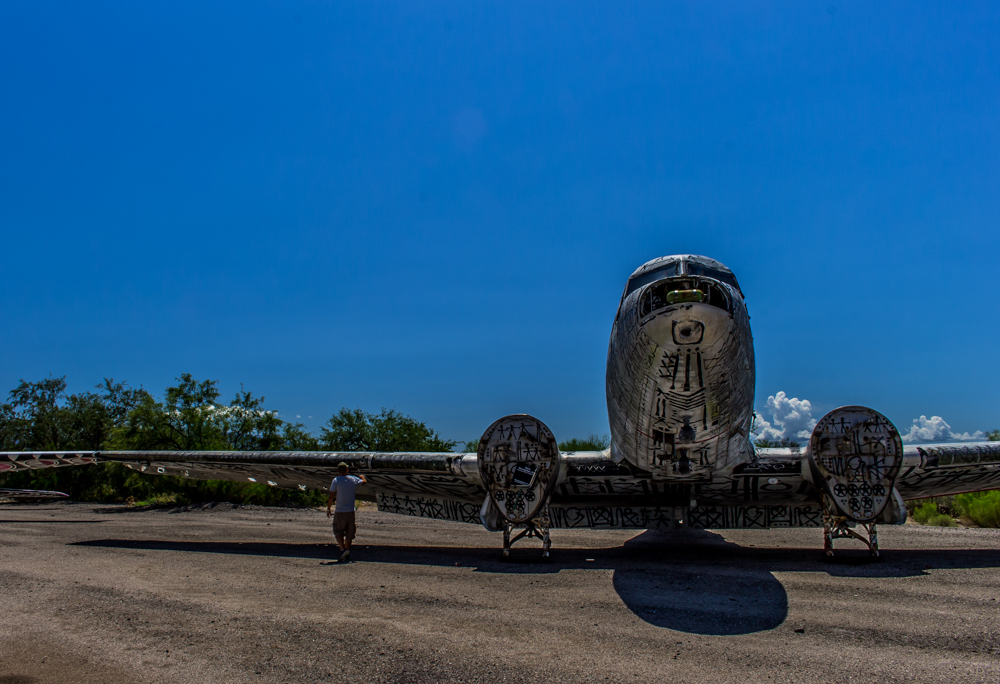 But when my friend Chris (known around here as The Brit) stumbled across some photos of abandoned airplanes painted by some notorious street artists, parked somewhere in the Arizona desert, he was intrigued. Being the kind of airplane aficionado that can spot an aircraft thousands of feet in the sky and tell you who made it, the model, how many people it can carry and where it’s probably coming from, he asked me if we could stop.